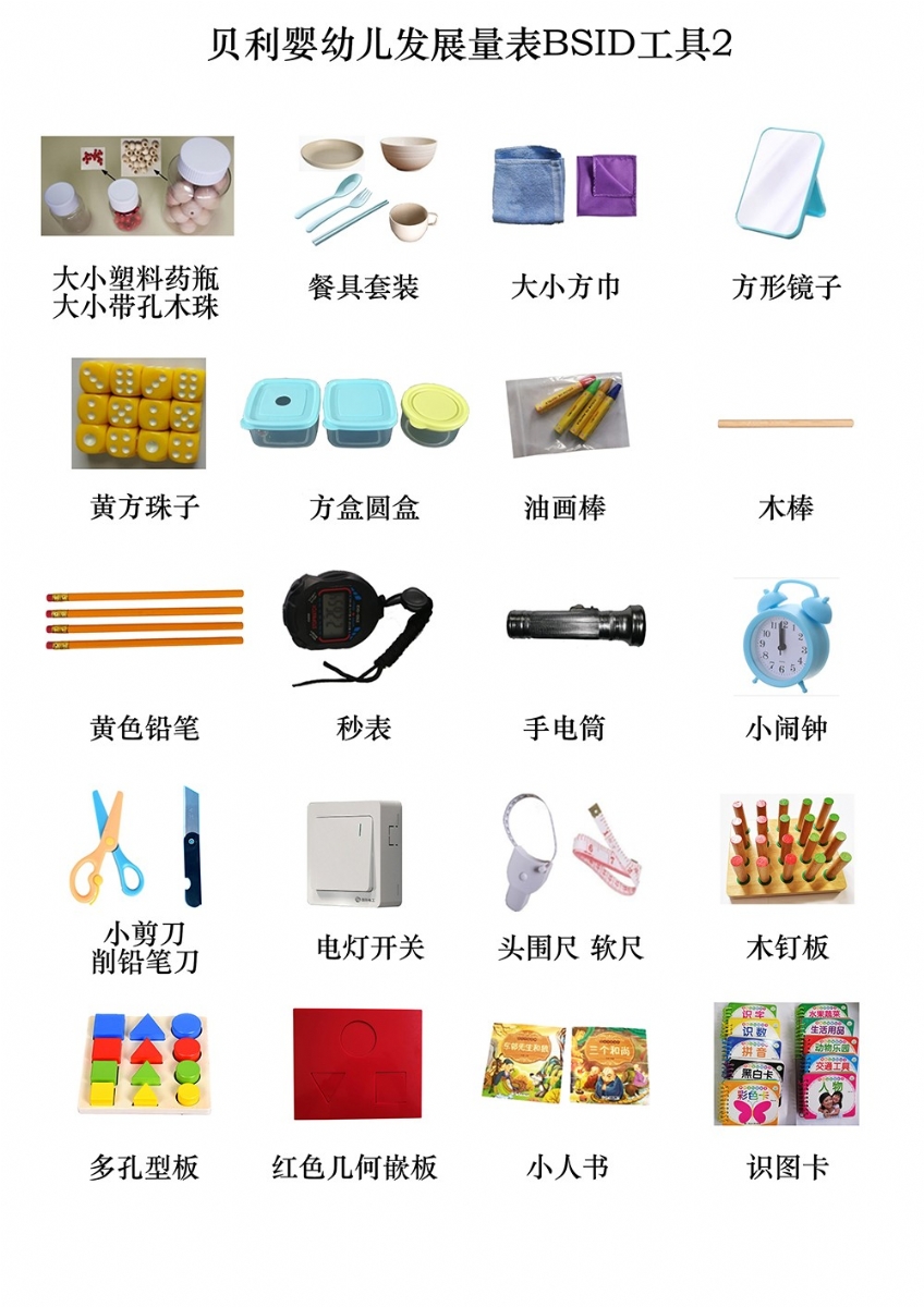 手握鈴鐺、小鈴鐺、花鈴棒、撥浪鼓、小沙錘、捏捏響玩具、玩具小椅子、拖拉玩具(帶線)、小正方體積木(紅12個(gè),黃藍(lán)綠各2塊)、可拆卸娃娃、布娃娃、圓環(huán)、紅球、大球、紅毛絨球、籃球、紅色小球、細(xì)繩、不銹鋼口杯、塑料杯、大號(hào)塑料藥瓶、小號(hào)塑料藥瓶、餐具套裝、大小方巾、方形鏡子、大木珠(帶孔)、小木珠(帶孔、)黃方珠子、塑料方盒、塑料圓盒、油畫(huà)棒、指揮棒、黃色鉛筆、秒表、手電筒、小鬧鐘、電燈開(kāi)關(guān)、頭圍尺、軟尺、木釘板、多孔型板(含圓形、方形、三角形各4塊)、幾何嵌板(含圓、三角、方形,厚8mm)、小人書(shū)識(shí)圖卡(果蔬、人物、動(dòng)物、交通等)、粉色卡紙、手帕紙、鐘表圖1234、圖畫(huà)12(BSID)、BSID采集表、BSID使用手冊(cè)、整理箱等。